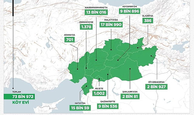 Bu kapsamda Kahramanmaraş’ta 13.016,Adıyaman’da 9. 896,Malatya’da 17.990,Hatay’da 15.059,Osmaniye’de 1.378,Adana’da 701,Elazığ’da 386,Diyarbakır’da 2.927,Şanlıurfa’da 2.081,Gaziantep’te 9.536,Kilis’te 1002 Köy evi yapılacak
