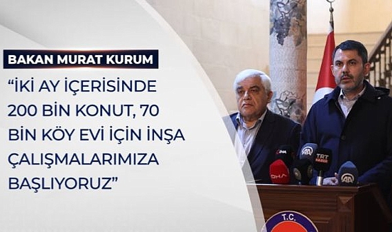 Bakan Kurum, daha önceki afetlerde olduğu gibi Kahramanmaraş Pazarcık ilçesi merkezli depremde de konutların 1 yıl içerisinde teslim edileceğini ifade edere, “Aynı anlayışla köylerimizdeki köy konutlarını da vatandaşlarımızın ihtiyacı doğrultusunda bir yıl içerisinde inşallah teslim edip, köylerimiz ile bu süreçte ayağa kaldıracağız. Bu kapsamda ilk etapta Osmaniye'de 1361, Adana'da 701, Adıyaman'da 8 bin 21, Diyarbakır'da 2 bin 927, Elazığ'da 386, Hatay'da 14 bin 141, Kahramanmaraş'ta 12 bin 135, Malatya'da 17 bin 990, Şanlıurfa'da 2 bin 54, Gaziantep'te 9 bin 130, Kilis'te 1002 olmak üzere toplamda 70 bin köy konutumuzu eviyle, ahırıyla, vatandaşlarımızın tüm ihtiyaçlarını karşılayacak anlayışla, yöresel mimariye, yaşam kültürüne uygun, terasıyla, dinlenme alanları ile bölgenin sosyolojik yapısını da düşünerek planlarımızı yaptık. Bugün buradaki yöneticilerimizle de paylaştık ve onların da fikirlerini, önerilerini aldık. Bu doğrultuda inşaat sürecini yürütüyor olacağız. İki ay içerisinde 200 bini konut, 70 bini köy evi olmak üzere 270 bin vatandaşımızı ailesiyle birlikte ev sahibi yapmak için inşa çalışmalarımıza başlıyoruz. İlerleyen günlerde de hasar tespit durumuna ve alanların master palan çalışmasının tamamlanmasına müteakip konutlarımızın etap etap ihalelerini gerçekleştireceğiz ve hızlı bir şekilde inşaat sürecine gireceğiz. Ben yeni yuvalarımızın, yeni köy konutlarımızın şimdiden milletimize hayırlı olmasını diliyorum.” dedi.
