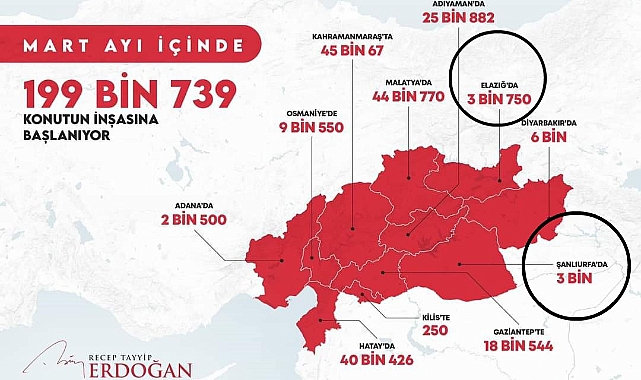 Cumhurbaşkanı Erdoğan sözlerini şöyle sürdürdü: "Depremden tek bir binası bile hasar almadan alnının akıyla çıkan TOKİ'miz hazırlıklarını hızla sürdürüyor. Mart ayı içinde Hatay'da 40 bin 426 konutun, Kahramanmaraş'ta 45 bin 67 konutun, Adıyaman'da 25 bin 882 konutun, Gaziantep'te 18 bin 544 konutun, Malatya'da 44 bin 770 konutun, Osmaniye'de 9 bin 550 konutun, Diyarbakır'da 6 bin konutun, Şanlıurfa'da 3 bin konutun, Elazığ'da 3 bin 750 konutun, Adana'da 2 bin 500 konutun, Kilis'te 250 konutun inşasına başlıyoruz. Hasar tespit enkaz kaldırma ve yer belirleme işlemleri bittikçe her ilimizde bu konut sayıları artacaktır."
